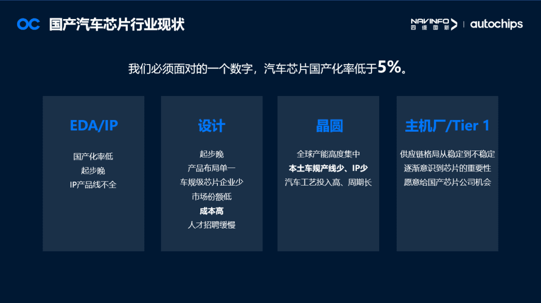 ±¨¸æÌáµ½Ò»¸öÑÏËàµÄÊý×Ö£ºÖйúÆû³µÐ¾Æ¬¹ú²ú»¯ÂÊȱ·¦5%£¬´ÓÉÏÓεÄEDA/IP·þÎñÉÌ¡¢Éè¼Æ³§ÉÌ£¬µ½¾§Ô²ÖÆÔ죬ÔÙµ½ÏÂÓεÄÖ÷»ú³§ºÍTIER 1Ó¦Óã¬Ã¿¸ö»·½Ú¶¼±£´æ×ÅһЩÎÊÌâ ¡£ÎÒÃDZØÐèÉî¿ÌÊìϤµ½×ÔÉíµÄÎÊÌ⣬²Å»ªÕÒ³ö¶ÔÓ¦µÄ¾öÒé ¡£