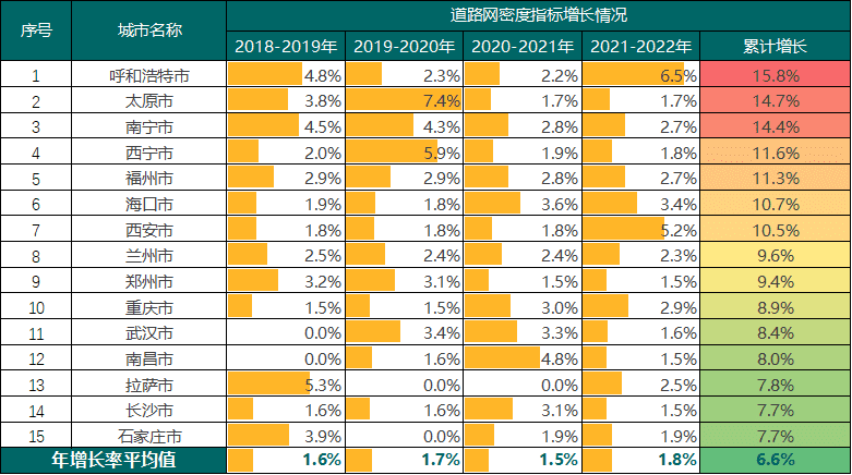 ºôºÍºÆÌØ¡¢Ì«Ô­¡¢ÄÏÄþµÈ¶¼»áÒ»Á¬½Ï¿ìËÙÔöÌí£¬Î÷Äþ¡¢¸£ÖÝ¡¢º£¿Ú¡¢Î÷°²µÈ¶¼»áÀÛ¼ÆÔöÌíÁè¼Ý10%¡£´ÓÌìÏÂÖ÷Òª¶¼»áÒ»Á¬5ÄêµÄõè¾¶ÍøÃܶÈÖ¸±êÔöÌíÇéÐÎÀ´¿´£¬ÀÛ¼ÆÔöÌí·ù¶È×î´ó¶¼»áΪºôºÍºÆÌØ£¬ÀÛ¼ÆÔöÌíÔ¼15.8%£¬õè¾¶ÍøÃܶÈÖ¸±ê´Ó4.2km/km2ÌáÉýÖÁ4.9km/km2¡£Æä´ÎΪ̫ԭÊкÍÄÏÄþÊУ¬Ì«Ô­ÊÐÀÛ¼ÆÔöÌíÔ¼14.7%£¬õè¾¶ÍøÃܶÈÖ¸±êÓÉ5.2km/km2ÌáÉýÖÁ6.0km/km2£»ÄÏÄþÊÐÀÛ¼ÆÔöÌíÔ¼14.4%£¬õè¾¶ÍøÃܶÈÖ¸±êÓÉ6.6km/km2ÌáÉýÖÁ7.6km/km2£¬ÔöÌíÁË1.0km/km2¡£Î÷Äþ¡¢¸£ÖÝ¡¢º£¿Ú¡¢Î÷°²µÈ¶¼»áҲʵÏÖÁËõè¾¶ÍøÃܶȵÄÒ»Á¬ÌáÉý¡£
